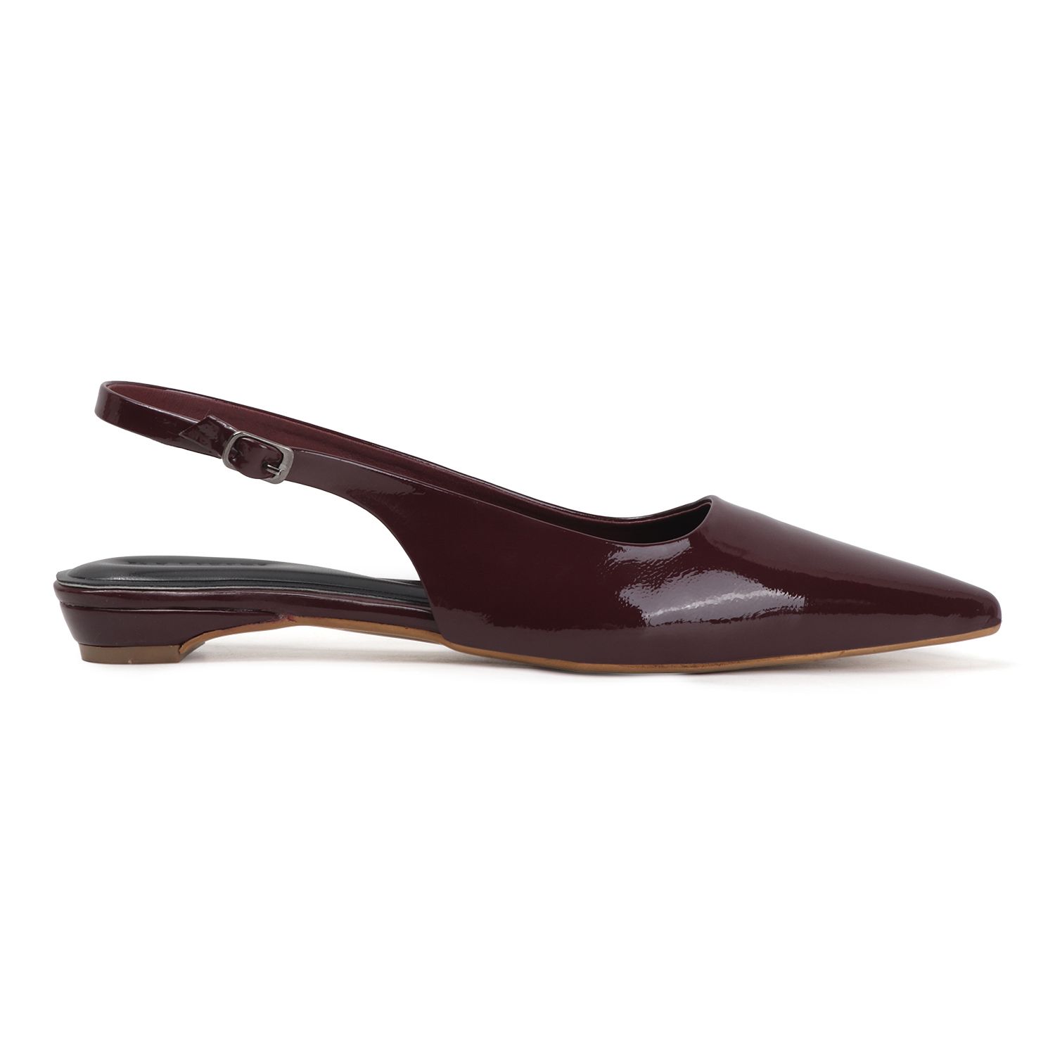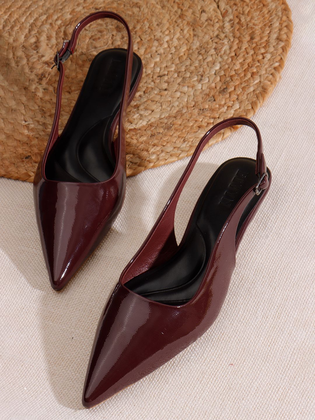- Product DescriptionStep into sophistication with these ELVYN slingback pumps. Crafted with a sleek, high-shine patent finish in a deep burgundy wine hue, these heels feature a sharp pointed-toe silhouette and a modest kitten heel for all-day elegance. The adjustable buckle strap ensures a secure and customized fit, making them a versatile choice for both office hours and evening outings.
