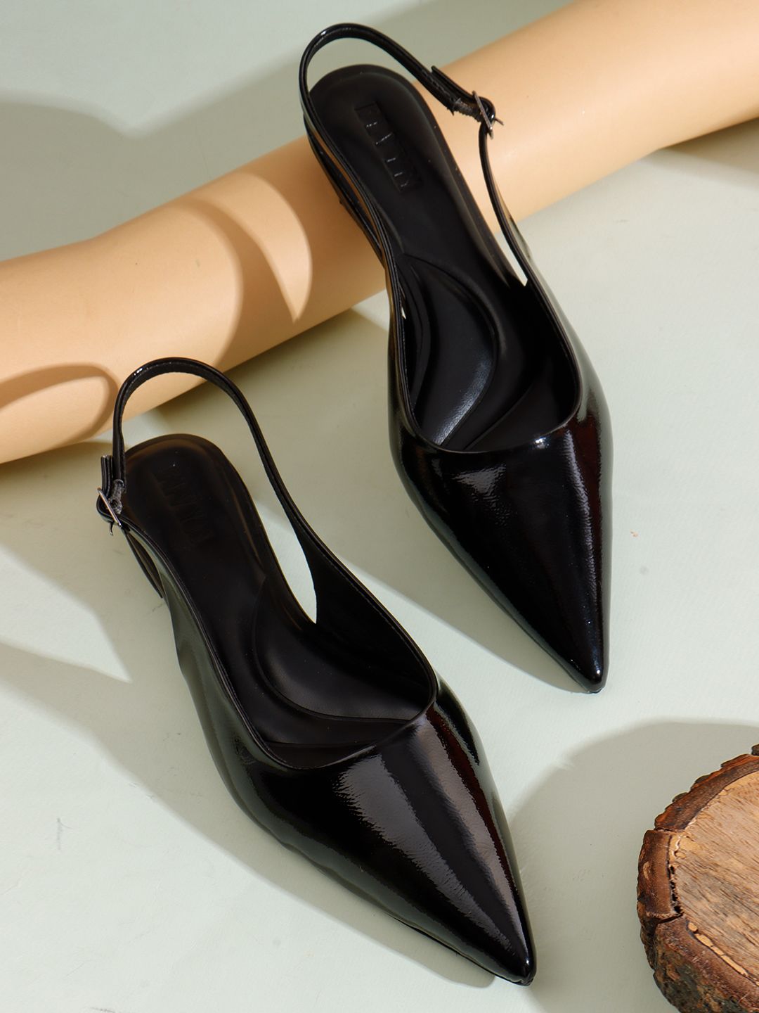 • Product DescriptionStep into timeless sophistication with the ELVYN Jane Collection. These elegant slingback flats are crafted from high-gloss black patent leather, offering a polished finish that effortlessly transitions from professional office wear to chic evening attire.The sleek pointed-toe design creates an elongated, feminine silhouette, while the open-back slingback strap ensures a secure and customizable fit with its adjustable silver-toned buckle. Designed for all-day comfort, these flats feature a soft memory foam cushioned insole and a low, stable flat heel, making them a versatile essential for any fashion-conscious wardrobe.Key Features